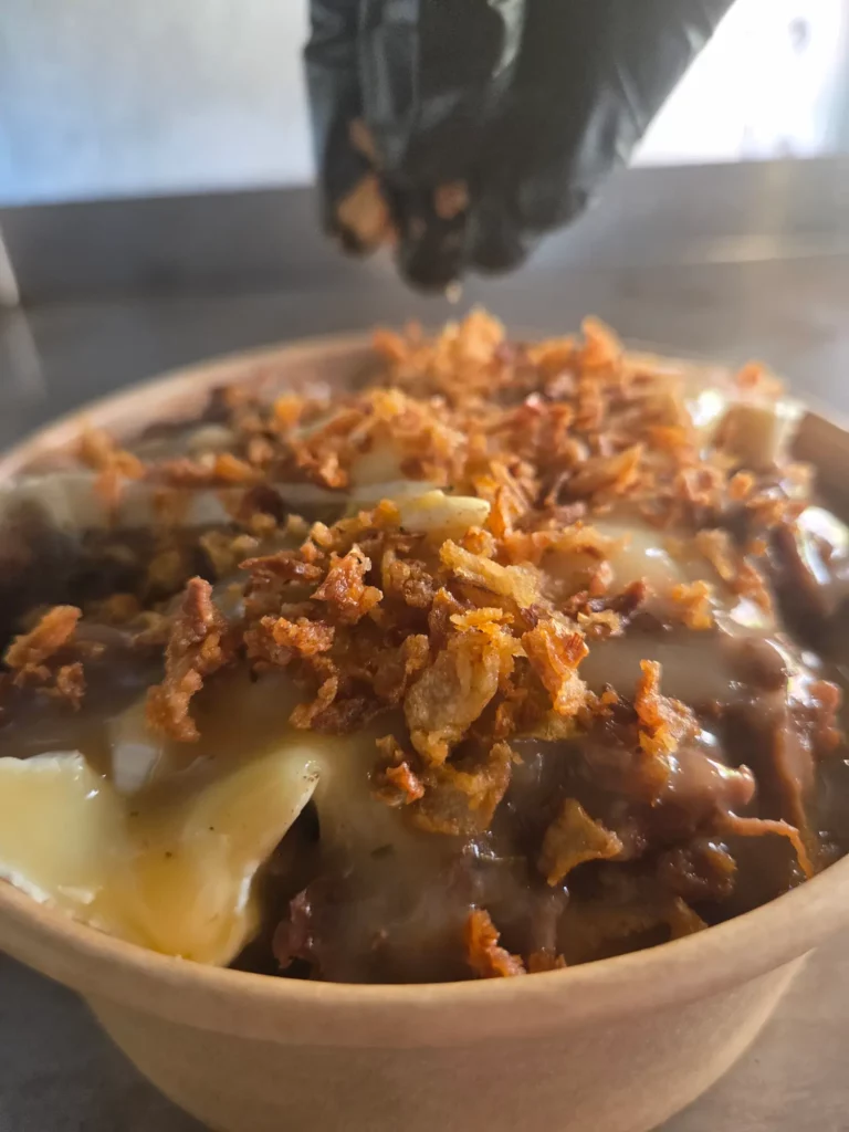 Frites maison, effiloché de bœuf, Reblochon AOP, nappés de sauce maison, oignons frits